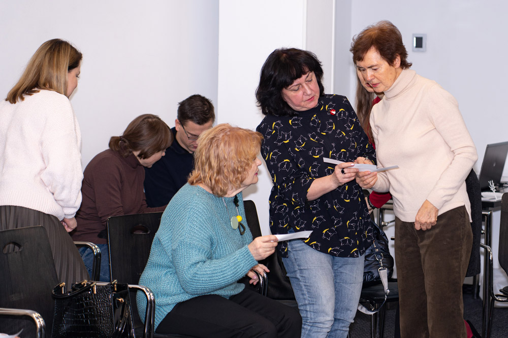 Вечер начался с игры. Все присутствующие получили половину изречения, выражающего оптимистичное отношение к жизни. Нужно было найти его другую половину, сопоставив тексты разных участников. Встретив свою половинку, её обнять, а затем вместе озвучить полный текст. С этой задачей справились все!