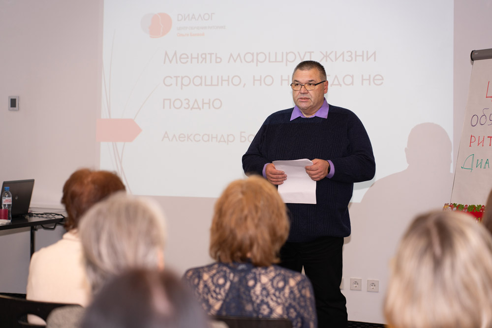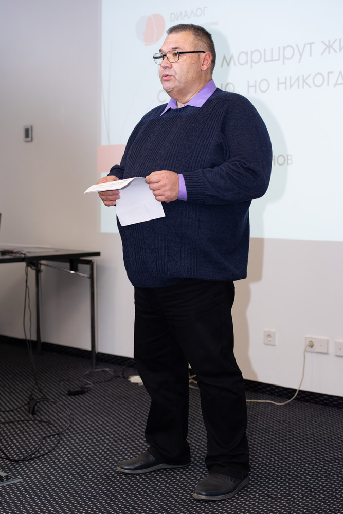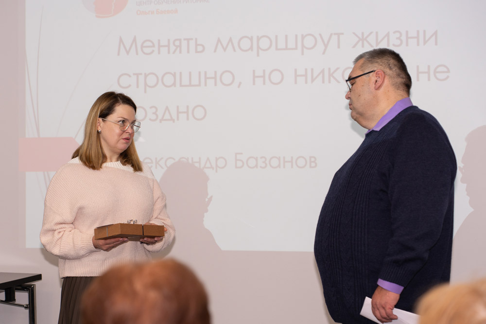 Следующее выступление нашего выпускника Александра Базанова прошло в тишине внимания и поддержки зала. Александр рассказал о том, как тяжёлое заболевание не сломило его, а привело к другому взгляду на свою профессию, поиску новых смыслов в жизни. Тема выступления: «Менять маршрут жизни страшно, но никогда не поздно». Специалист, успешно реализовавшийся в своей профессии, пошёл учиться на серьёзные курсы в трёх направлениях. Мы верим, что обучение, жизненный опыт и мудрость позволят Александру успешно реализоваться в новом деле – стать коучем.